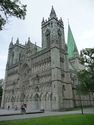 I very much enjoyed Trondheim Cathedral, the major attraction of this "gateway to the north." It is the national cathedral, Trondheim being once the capital, a martyrdom/pilgrimage site, the site also of coronations and burials of Norwegian royalty. It is gray soapstone, 11th-13th century, originally Romanesque, then Gothic, as is usually the case with this vintage. It has beautiful stained glass, unlike the rest of Scandinavia we have seen, but was very dark inside, in part because of the stone, in part because of its park setting, in part because it was a very gray day. No pictures inside were allowed; not that they would have turned out. The exterior is striking, the size, color, and, especially, the intactness of it all. The Protestants looted this cathedral when they took over, but did not deface it. So, if you want to see a real 13th century cathedral, unspoiled by war, revolution, or ecclesiastical change, Trondheim is a great treat. I don't know of anything else like it. The west face, the typanum, are really incredible.