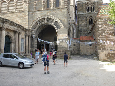 Pilgrims (pelerins) or possibly pilgrim re-enactors, approaching