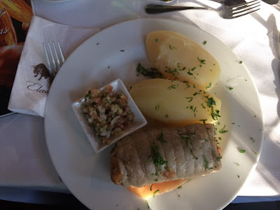 | My Arrullado Huasco...pork loin baked in a huge roll of pork fat; two full-grown potatoes that I didn't even touch |