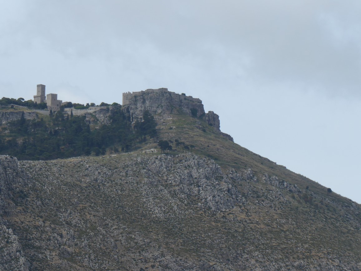 The Medieval mountain-top village of Erice was not among our more successful visits. Granted, we got there, but we did not stay very long, finding ourselves on a one-way alley through a labyrinth whose end was very uncertain. Especially in an RV. We should have parked at the RV/bus lot and walked the kilometer up-hill. But we thought there was a higher car-park we could find, and by the time we had passed it, if it exists, we were committed. We stopped at the top, by the castle ruins, I reconned on foot, and we boldly headed back down, every twist and turn a drama. The exit through the gate in the old wall was a special thrill. When will we learn?!