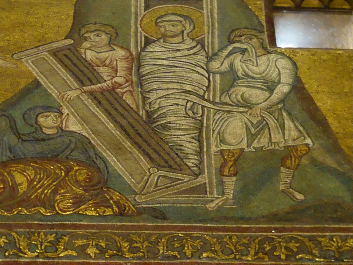 My favorite place in Palermo, if not in all of Sicily, is the Chapel of the Royal Palace in Palermo. There the golden 12th century mosaics adorn every square inch of the walls. Same subject matter as Monreale, that is, Biblical stuff, very high quality Byzantine-style, by my lights, but it's all in a chapel, well-lit, clean, and so close you can almost touch it. The analogy of Notre Dame de Paris and Saint-Chapelle comes to mind in thinking of Monreale and the Royal Chapel. We spent a good 90 minutes in the Royal Chapel savoring it all. I posted about