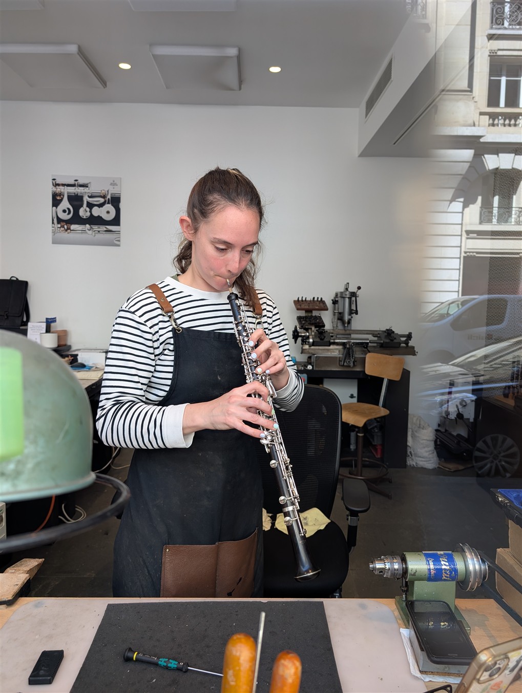 As I was saying, you can hardly walk a block in Paris without seeing something of interest...and there we were, walking along the Rue Montalembert, in the 7th, minding our own business, when Vicki exclaims "Oboes!" I look in the window, and sure enough, there is a young woman playing the oboe. And lots of oboes and oboe accessories. We are passing by the oboe division of Buffet Crampon, fabricant of wind instruments. They make oboes here. Very good ones. As a former oboist (5th through 11th grades), I am enthralled. Students of this blog know that we have already featured oboes and oboists in many, many different settings...just search oboe and oboist in the search box. We didn't set foot in the atelier...not in the market for a $12,000 oboe currently...but will surely look into their massive showroom on the Boulevard St. Germain sometime soon. Paris...!