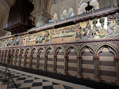 Nave view; spiffed-up enough for visitors; the cleaning and restoration work was nothing short of monumental; Vicki and I do not like the 800 year-old "like-new" look; not one of our favorite cathedrals, anyway, nonetheless... |