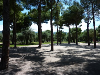 A tree-lined, telephone pole-line, railway-lined road, with a