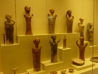 tholos (round) tomb, a tumulus, sort of, but with a monumental beehive stone structure beneath. We toured it the next morning, and then did Mycenae, a few hundred yards up the hill, and its museum. All this is Bronze Age, 16th-12th centuries BC, the stuff of Homer. Well, the stuff Homer wrote about, centuries later. Mycenae was Agamemnon's home town. Also Clytemnestra's,